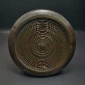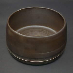 Cette pièce de la série Lotus présente une forme arrondie et contenue, avec un galbe régulier et un bord légèrement irrégulier, témoin du façonnage manuel. Sa surface en terre cuite sombre, douce au toucher, est ponctuée de stries tournées en partie basse, apportant une discrète animation au volume.