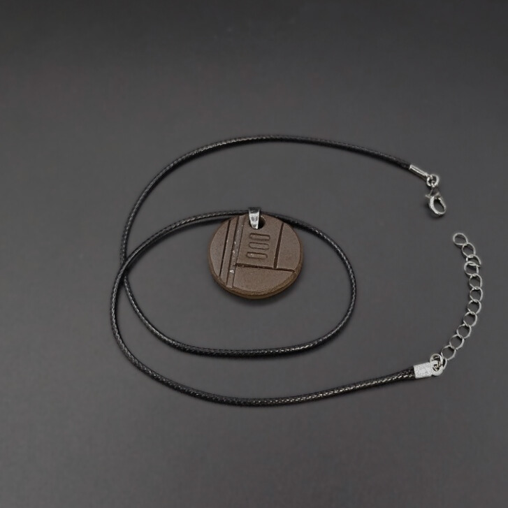 Collier — pendentif en céramique sigillée, décoré et façonné à la main. Tour de cou en nylon réglable (44 cm à 49 cm) avec fermoir métallique.